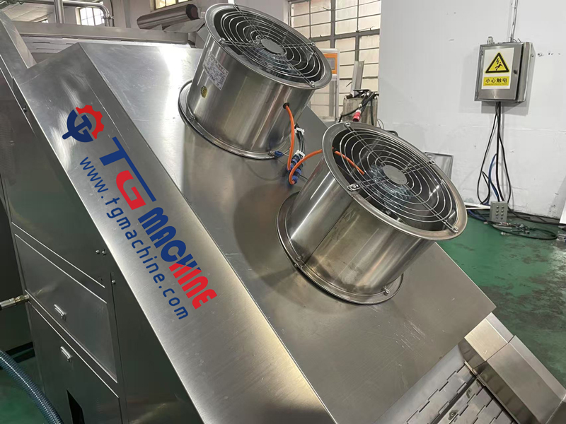 تعمل السيور الناقل على نقل الفشار إلى وحدة التبريد والغربلة الدوارة، وتتميز مرحلة التبريد الأولية بـ: